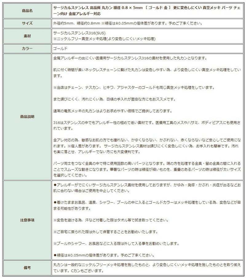 * 送料込み *[20個] [ 高品質 イオンP 丸カン 5mm ] [ ゴールド 金 ] サージカルステンレス 線径0.8mm サージカルステンレス更に変色しにくい パーツ チェーン向け 金属アレルギー対応 CA-01
