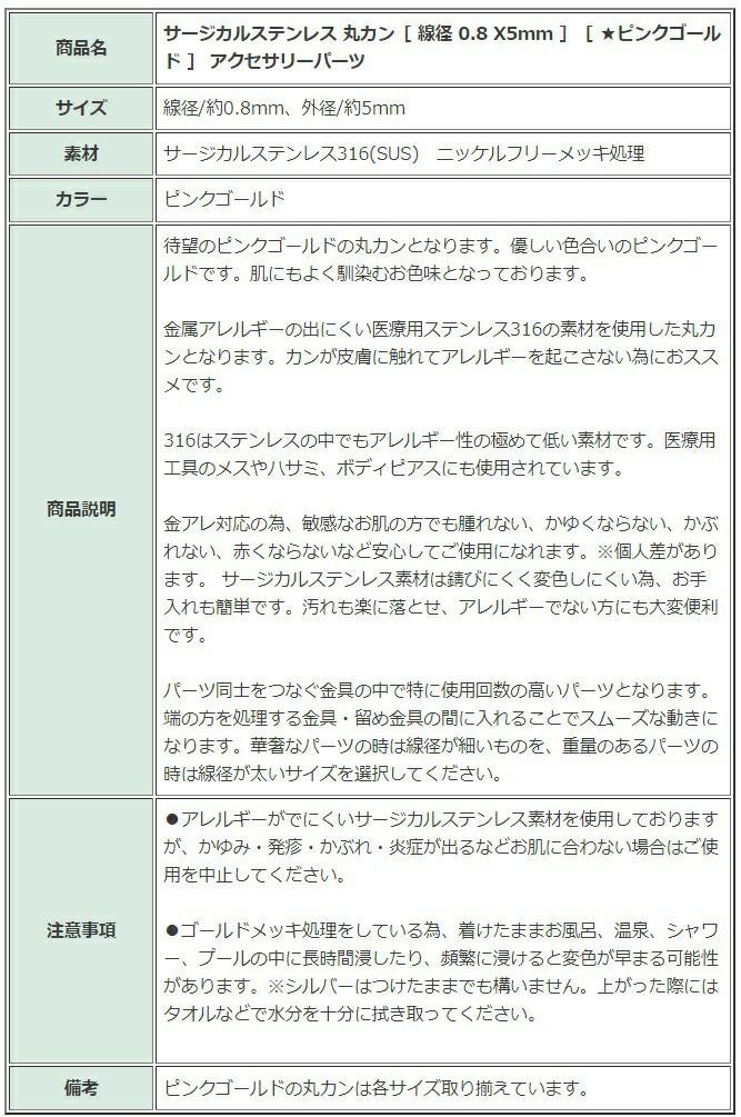 * 送料込み *[50個] [ 丸カン 5mm ][ ★ピンクゴールド ] サージカルステンレス 線径0.8mm アクセサリー パーツ 金アレ CA-01