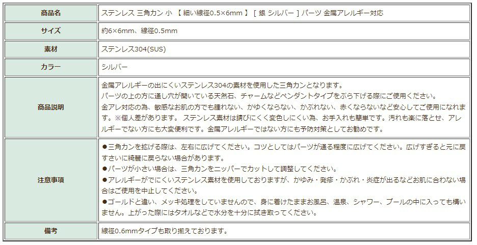 変色しない、かぶれないステンレスSUSのアクセサリー用の三角カンとなります。