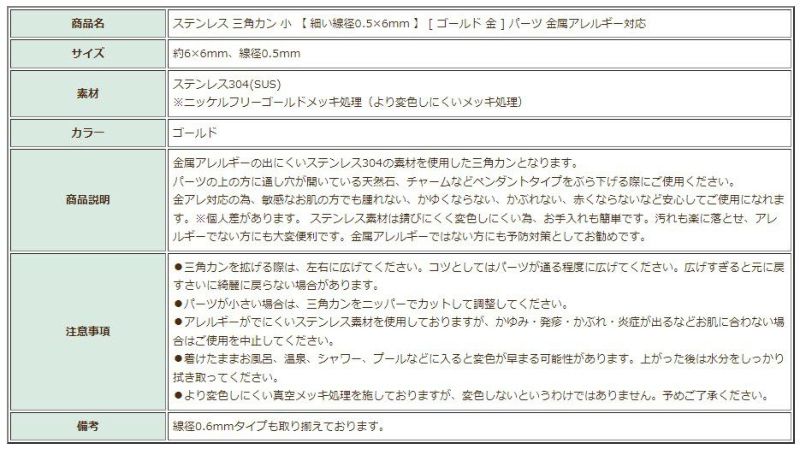 商品名 ステンレス 三角カン 小 【 細い線径0.5×6mm 】 [ ゴールド 金 ] パーツ 金属アレルギー対応
