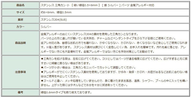 商品説明 金属アレルギーの出にくいステンレス304の素材を使用した三角カンとなります。