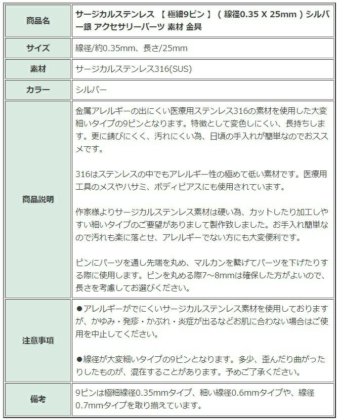 他の画像を見る 金属アレルギー 医療用 素材 お手入れ簡単 316 [30本] 【 極細 9ピン 】 ( 線径0.35 X 25mm ) [ 銀 シルバー ]サージカルステンレス アクセサリー パーツ 金アレ 金具 当店特別価格 ¥ 319 税込 在庫切れ 再入荷お知らせ お気に入りに登録する
