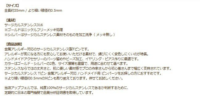 他の画像を見る 金属アレルギー 医療用 素材 お手入れ簡単 316L [30本] 9ピン 細い (0.6 X 30mm) [ ゴールド 金 ] サージカルステンレス アクセサリー パーツ 当店特別価格 ¥ 399 税込 在庫切れ 再入荷お知らせ お気に入りに登録する