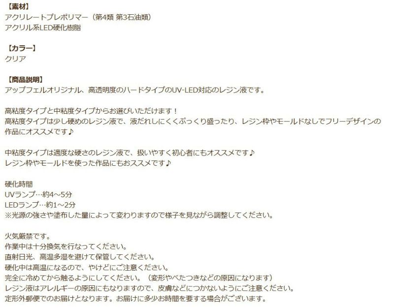 アップフェルオリジナル、高透明度のハードタイプのUV-LED対応のレジン液です。
