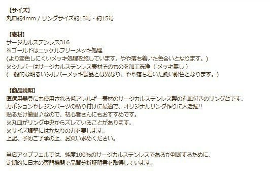 [ 10個 ]316 指輪 リング台 C ※ 約8号 中サイズ ※ 丸皿 4mm [ ゴールド 金 ] サージカルステンレス 台座 パーツ 金属アレルギー対応 O-02