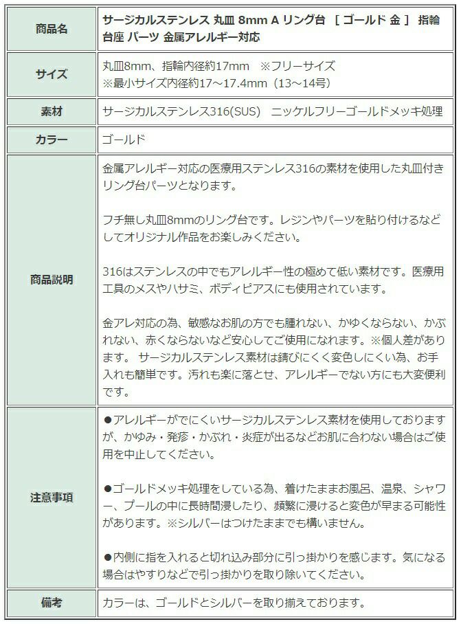 | 商品名 | サージカルステンレス 丸皿 8mm A リング台 [ ゴールド 金 ] 指輪 台座 パーツ 金属アレルギー対応 |
