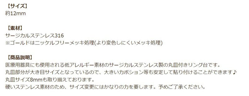 316 指輪 リング台 B 丸皿 ≪ 12mm ≫ [ ゴールド 金 ] サージカルステンレス 台座 パーツ 金属アレルギー対応 O-02