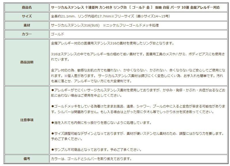 [2個]サージカルステンレス 十連並列 カン付き リング台 [ ゴールド 金 ] O-02 指輪 台座 パーツ 10連 金属アレルギー対応
