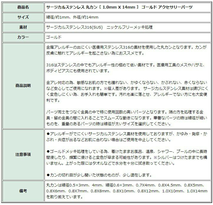 商品名 サージカルステンレス 丸カン[ 1.0mm X 14mm ] ゴールド アクセサリーパーツ
