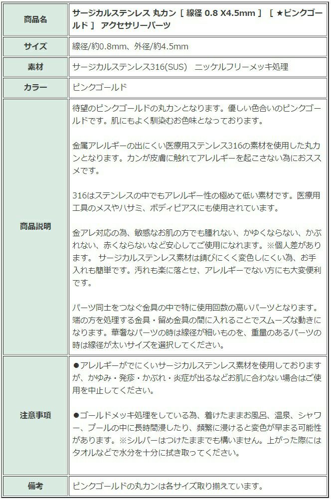 商品名 サージカルステンレス 丸カン[ 線径 0.8 X4.5mm ][ ★ピンクゴールド ] アクセサリーパーツ