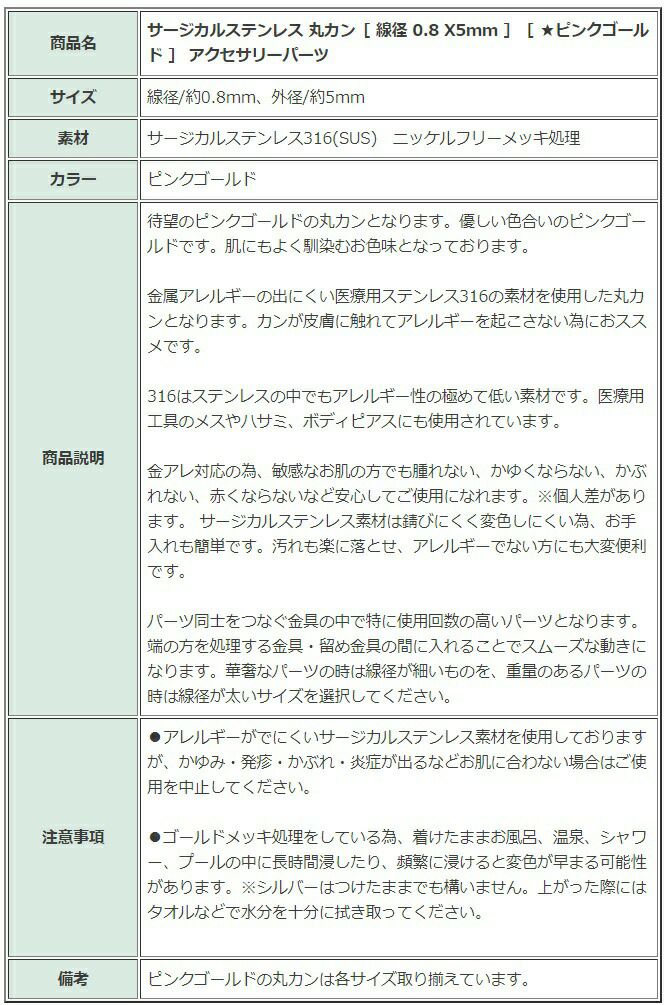 商品名 サージカルステンレス 丸カン[ 線径 0.8 X5mm ][ ★ピンクゴールド ] アクセサリーパーツ