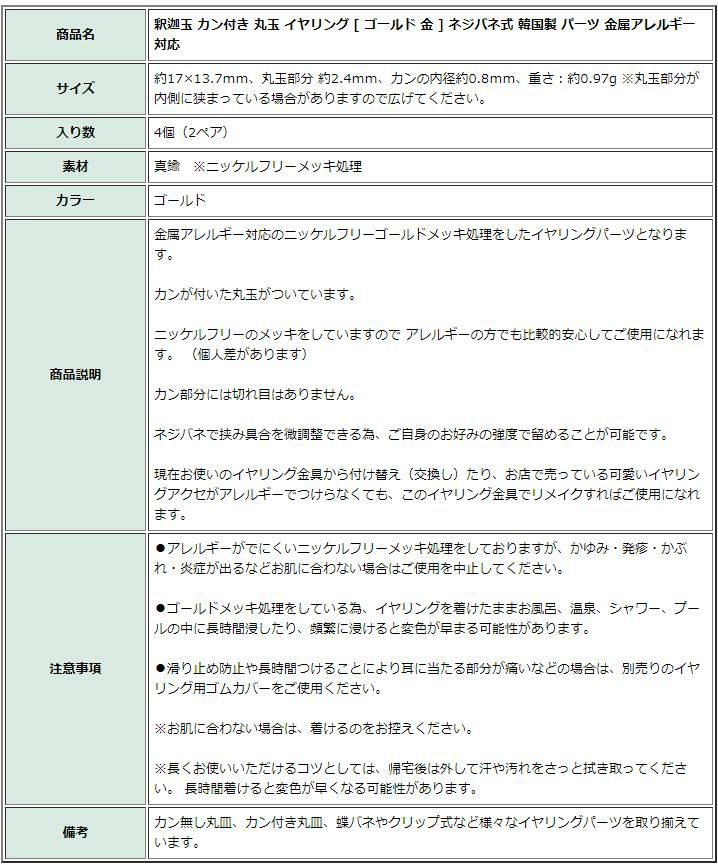 備考 カン無し丸皿、カン付き丸皿、蝶バネやクリップ式など様々なイヤリングパーツを取り揃えています。