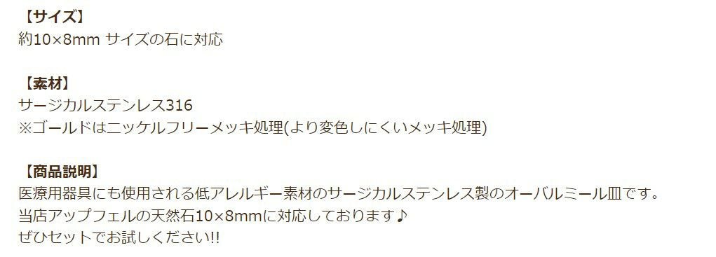 他の画像を見る 金アレ 316 素材 材料 ニッケルフリー 敏感肌 土台 貼付 レジン [10個] カン無し * ギザギザふち * ミール皿 オーバル 14×10mm [ ゴールド 金 ] サージカルステンレス パーツ 金属アレルギー対応 M2-05 当店特別価格 ¥ 989 税込 カートに入れる お気に入りに登録する