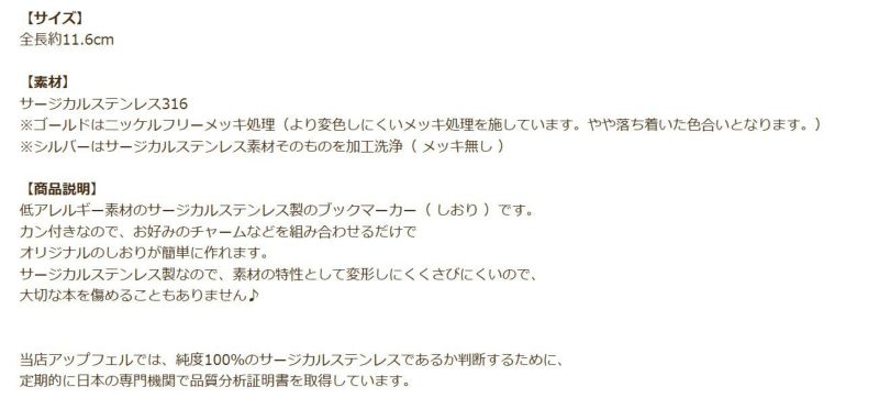 低アレルギー素材のサージカルステンレス製のブックマーカー( しおり )です。