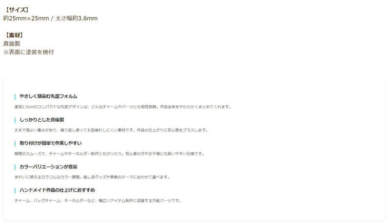 直径2.5cmのコンパクトな丸型デザインは、どんなチャームやパーツとも相性抜群。作品全体をやわらかくまとめてくれます。