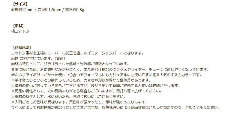 [4個] コットンパール 【 両穴 】 12mm * キスカ * 丸 パーツ 素材 O-01