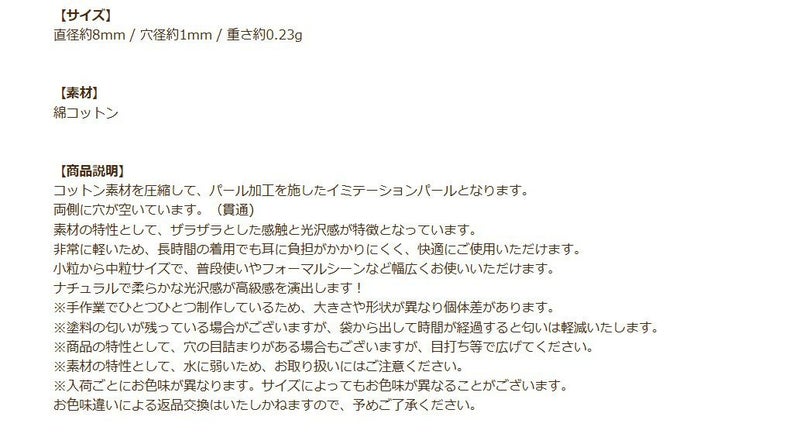 コットン素材を圧縮して、パール加工を施したイミテーションパールとなります。
