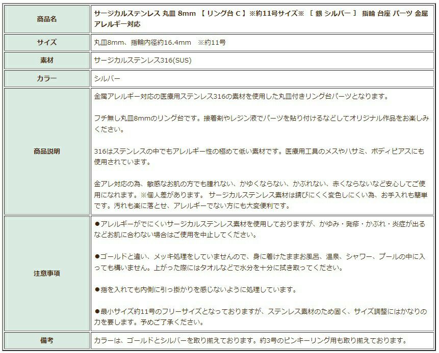 [ 5個 ]316 指輪 リング台 C ※ 約11号 大サイズ ※ 丸皿 8mm [ 銀 シルバー ] サージカルステンレス 台座 パーツ 金属アレルギー対応 O-02