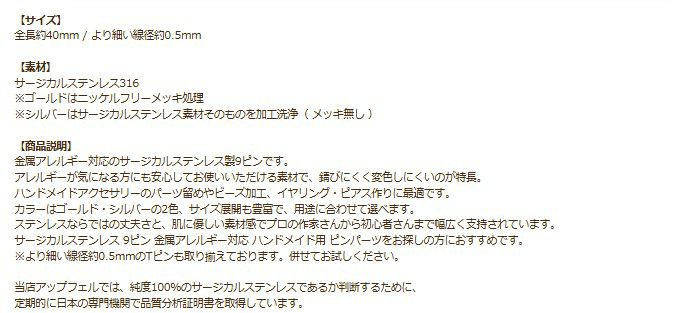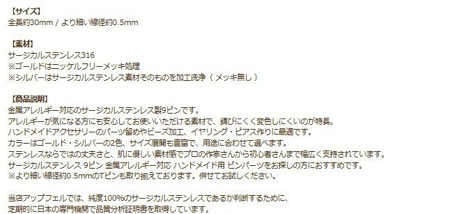 金属アレルギー対応アクセサリーパーツ通販・アップフェルのお取り扱いサージカルステンレスの一覧です。