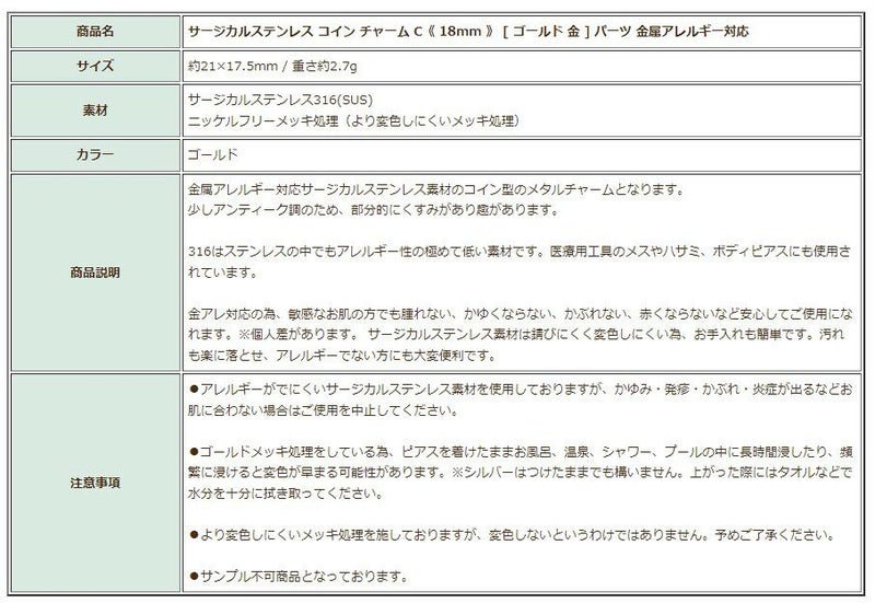 商品名 サージカルステンレス コイン チャーム C《 18mm 》 [ ゴールド 金 ] パーツ 金属アレルギー対応