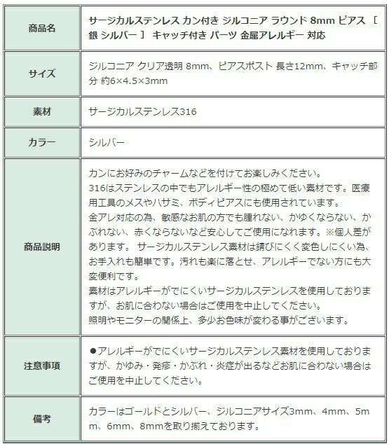 商品名 サージカルステンレス カン付き ジルコニア ラウンド 8mm ピアス [ 銀 シルバー ] キャッチ付き パーツ 金属アレルギー 対応