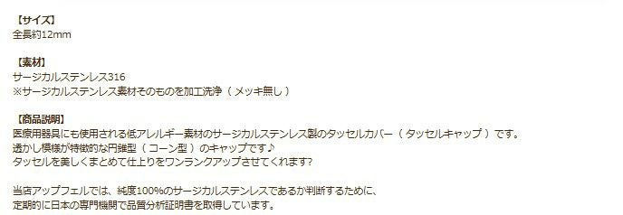 医療用器具にも使用される低アレルギー素材のサージカルステンレス製のタッセルカバー( タッセルキャップ )です。