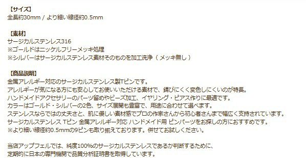 金アレ 316 素材 材料 ピン より細い ニッケルフリー 敏感肌