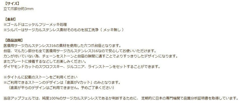 医療用サージカルステンレス316の素材を使用した六つ爪台座となります。