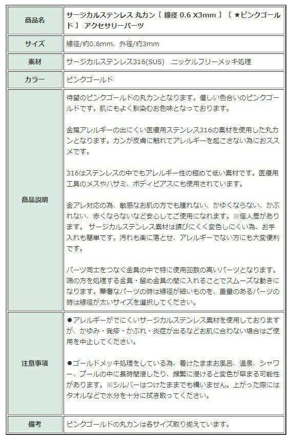 商品名 サージカルステンレス 丸カン[ 線径 0.6 X3mm ][ ★ピンクゴールド ] アクセサリーパーツ