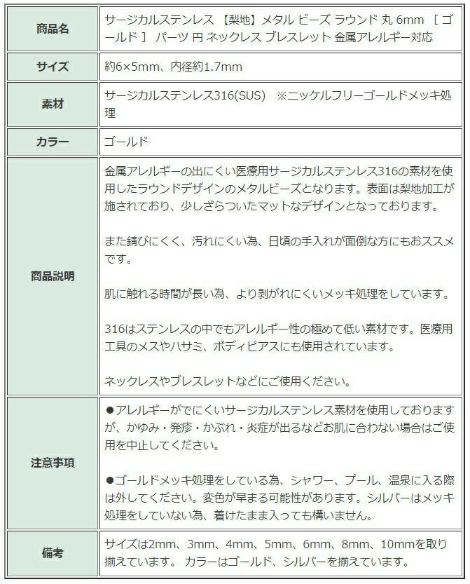 商品名 サージカルステンレス 【梨地】メタル ビーズ ラウンド 丸 6mm [ ゴールド ] パーツ 円 ネックレス ブレスレット 金属アレルギー対応