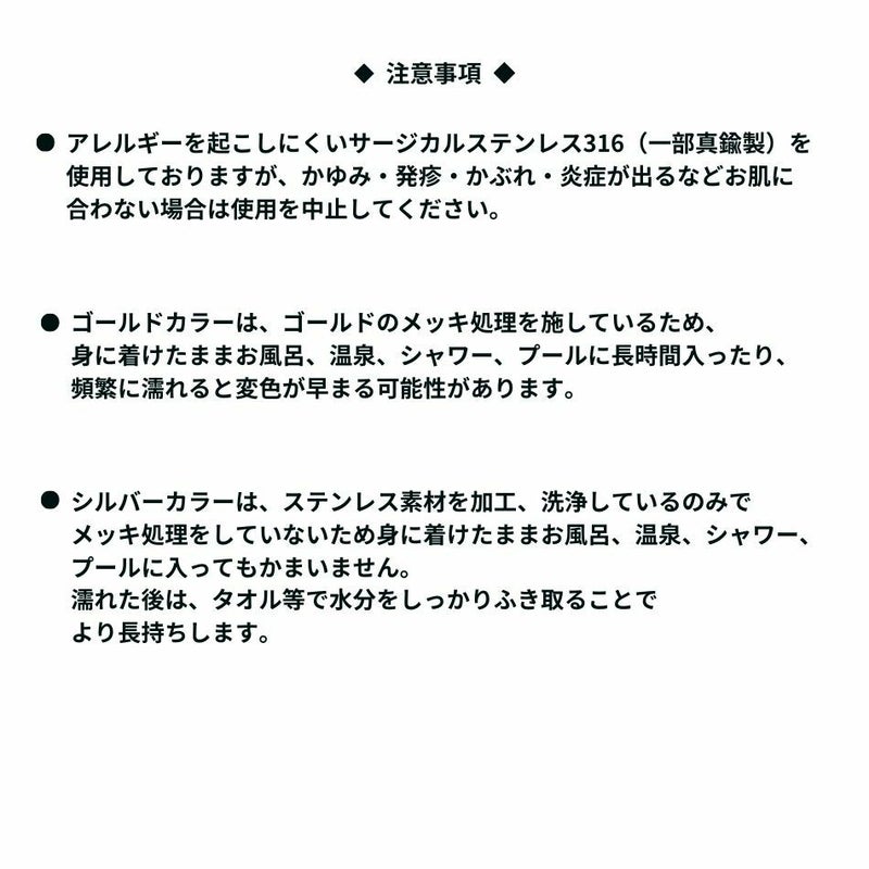 注意事項 ●アレルギーがでにくいサージカルステンレス素材を使用しておりますが、かゆみ・発疹・かぶれ・炎症が出るなどお肌に合わない場合はご使用を中止してください。