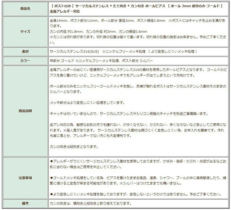 | 商品名 | 【 ポストのみ 】サージカルステンレス * たて向き * カン付き ボールピアス 【 ボール 3mm 部分のみ ゴールド 】金属アレルギー対応 |