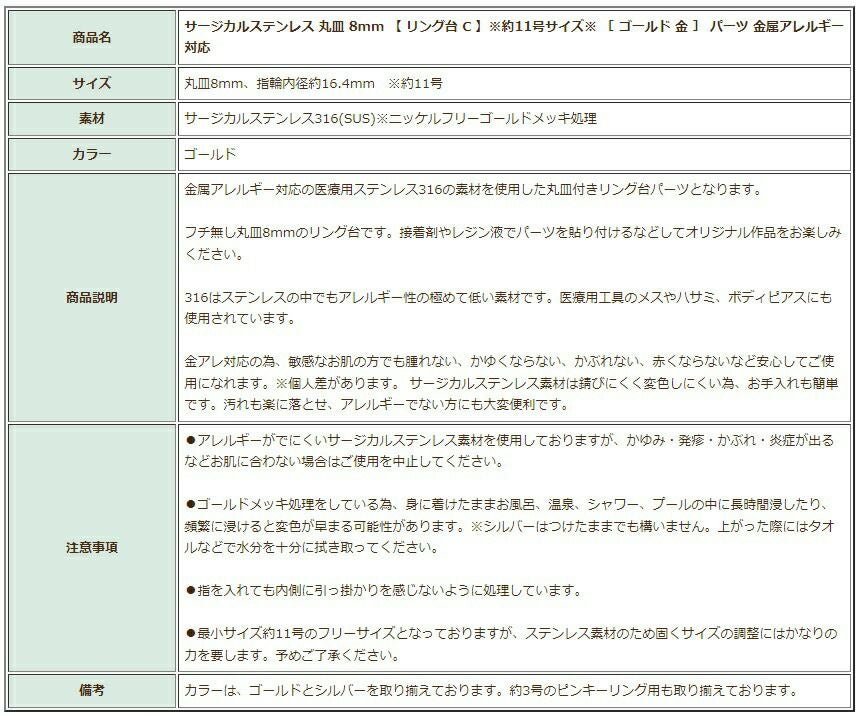 [ 10個 ]316 指輪 リング台 C ※ 約8号 中サイズ ※ 丸皿 6mm [ ゴールド 金 ] サージカルステンレス 台座 パーツ 金属アレルギー対応 O-02