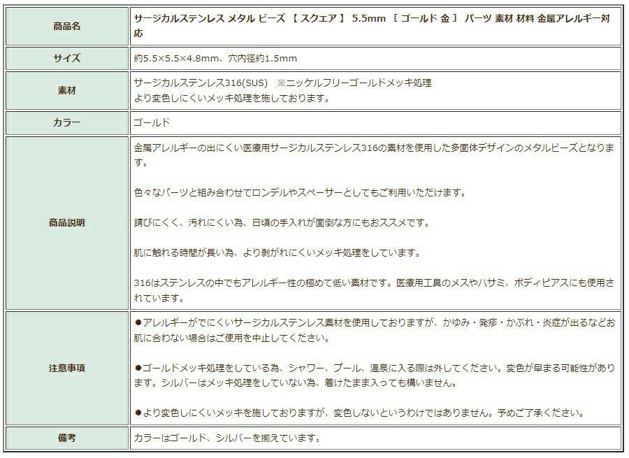 ゴールドカラーのアクセサリーパーツは、サージカルステンレス素材の上にメッキ処理をすることで表面にゴールドカラーの薄い被膜ができたものです。