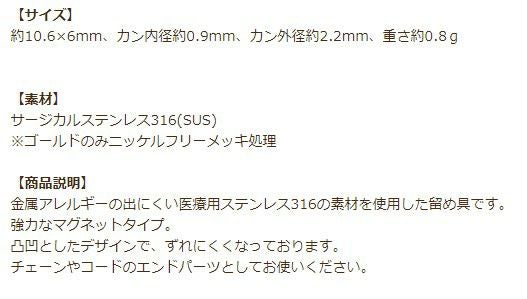 ゴールドカラーのアクセサリーパーツは、サージカルステンレス素材の上にメッキ処理をすることで表面にゴールドカラーの薄い被膜ができたものです。