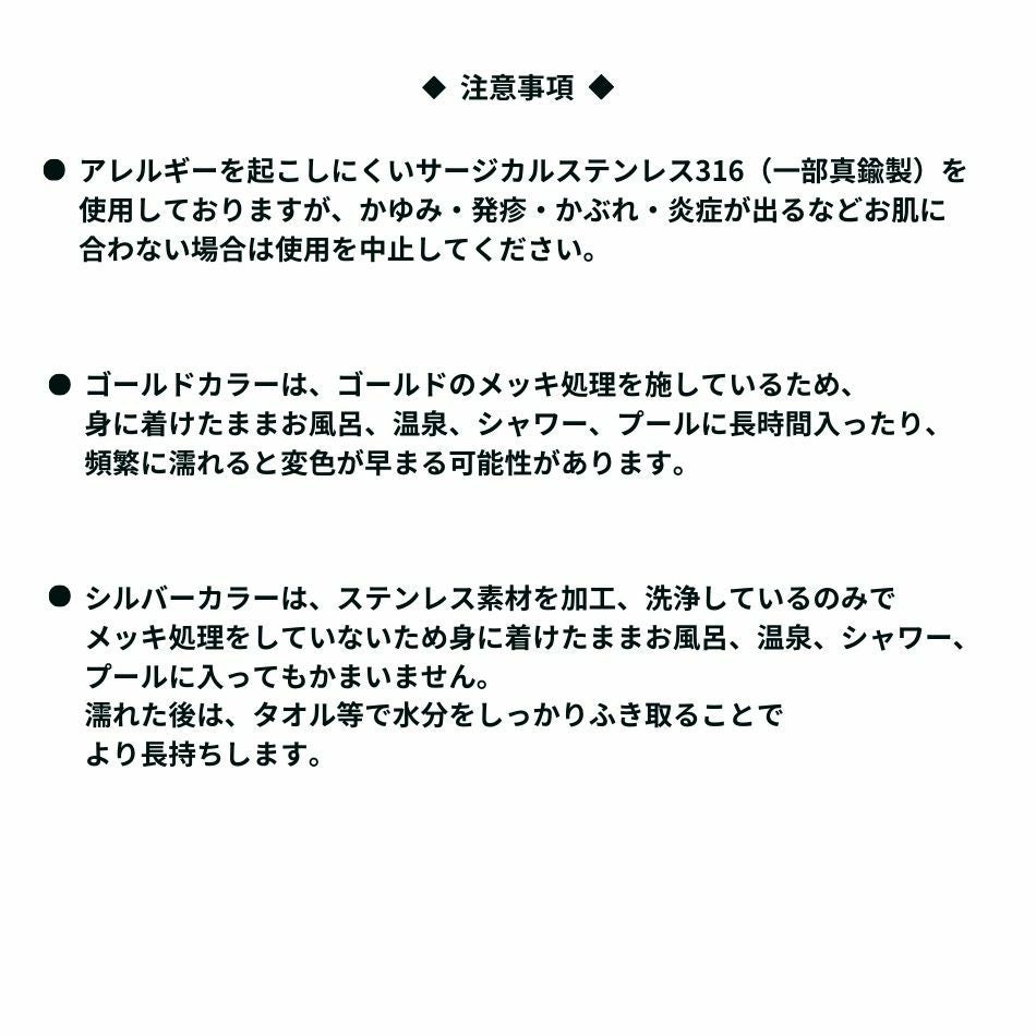 ※シルバー製品のみです。ゴールドはメッキ処理をしておりますので、変色防止の為にも外して温泉などに入ることをおすすめします。