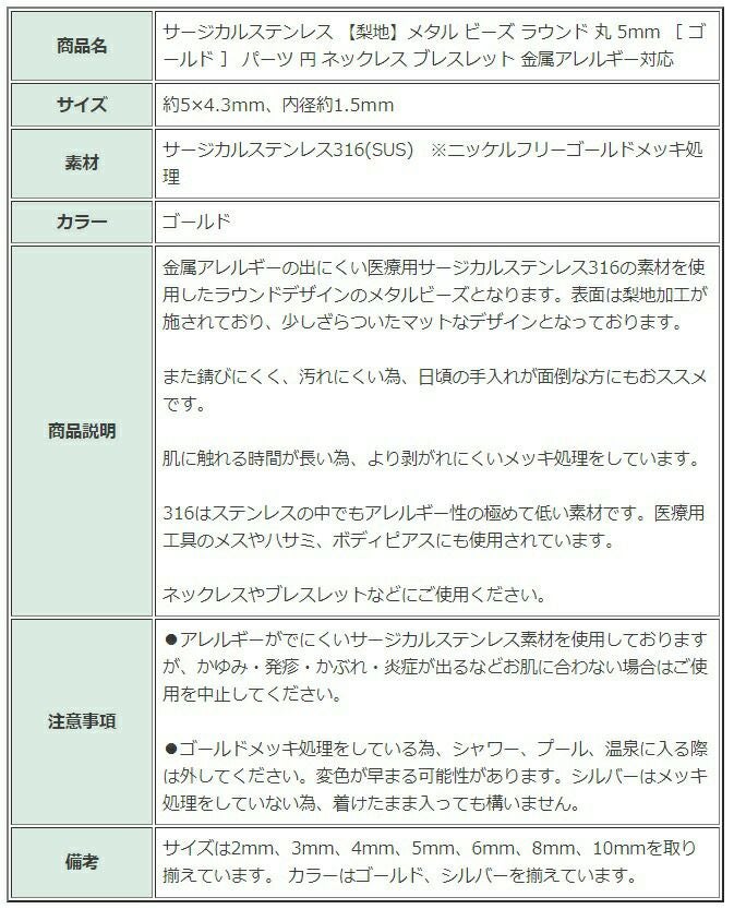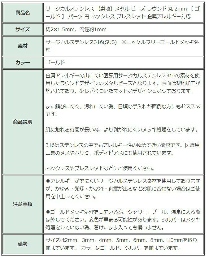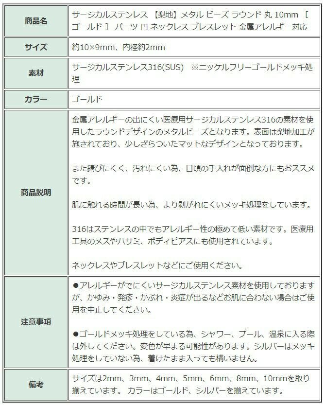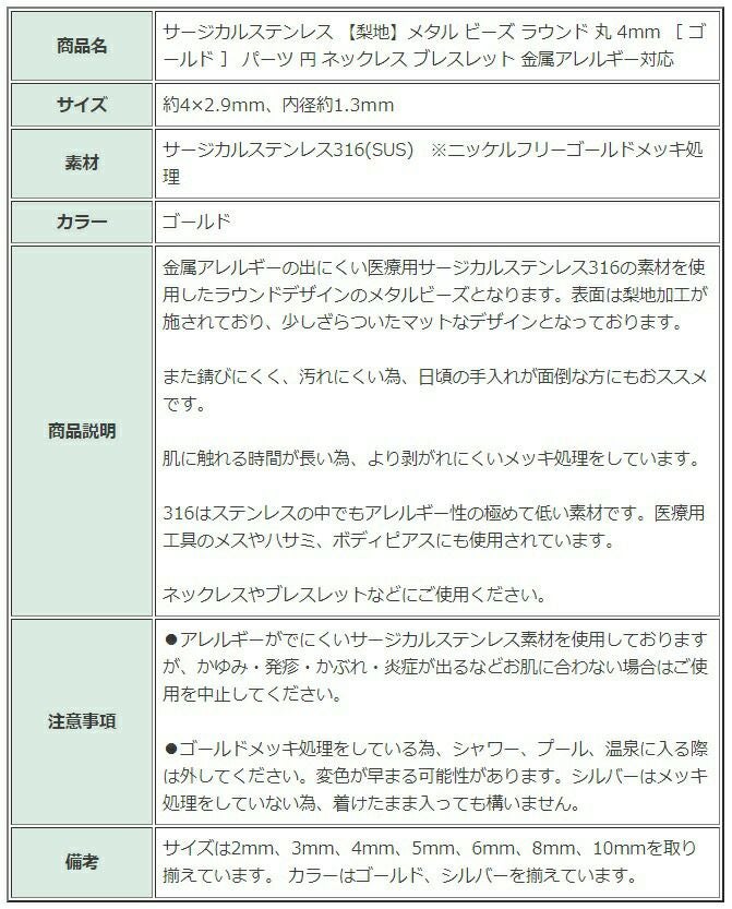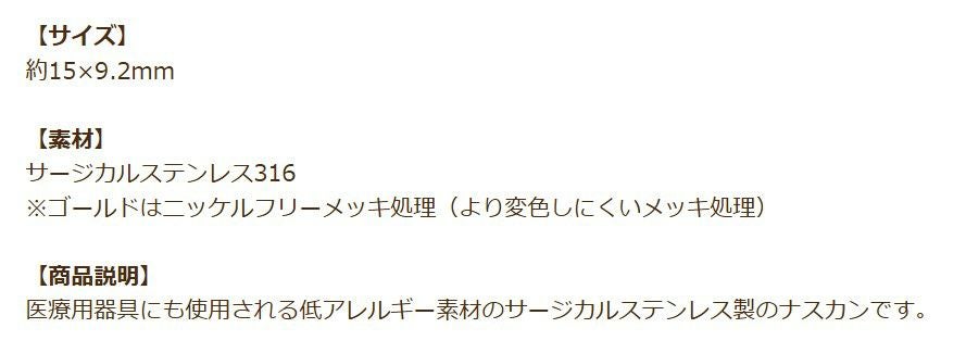 ゴールドカラーのアクセサリーパーツは、サージカルステンレス素材の上にメッキ処理をすることで表面にゴールドカラーの薄い被膜ができたものです。