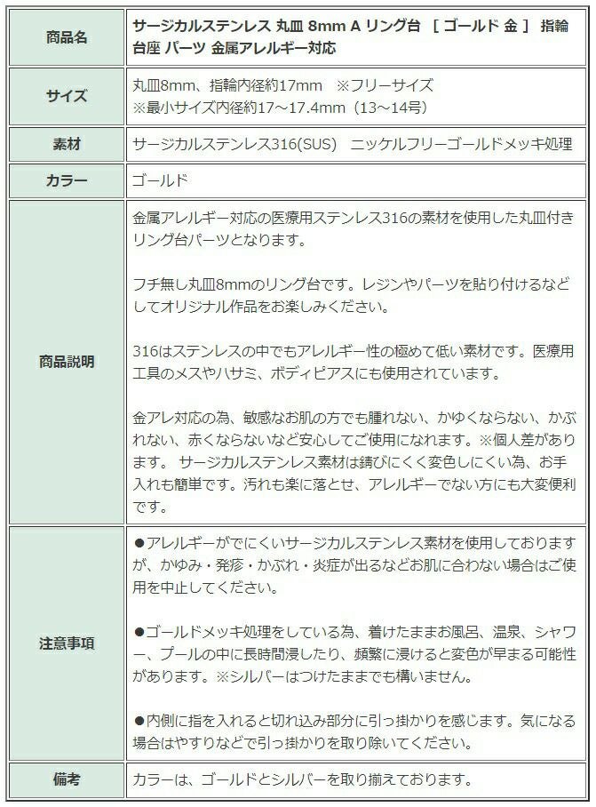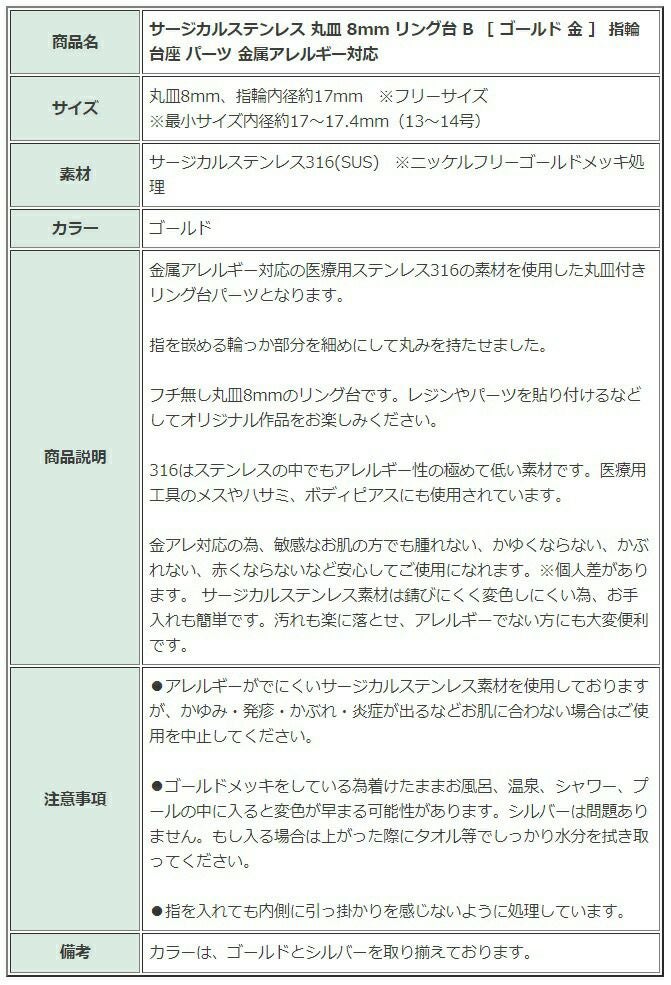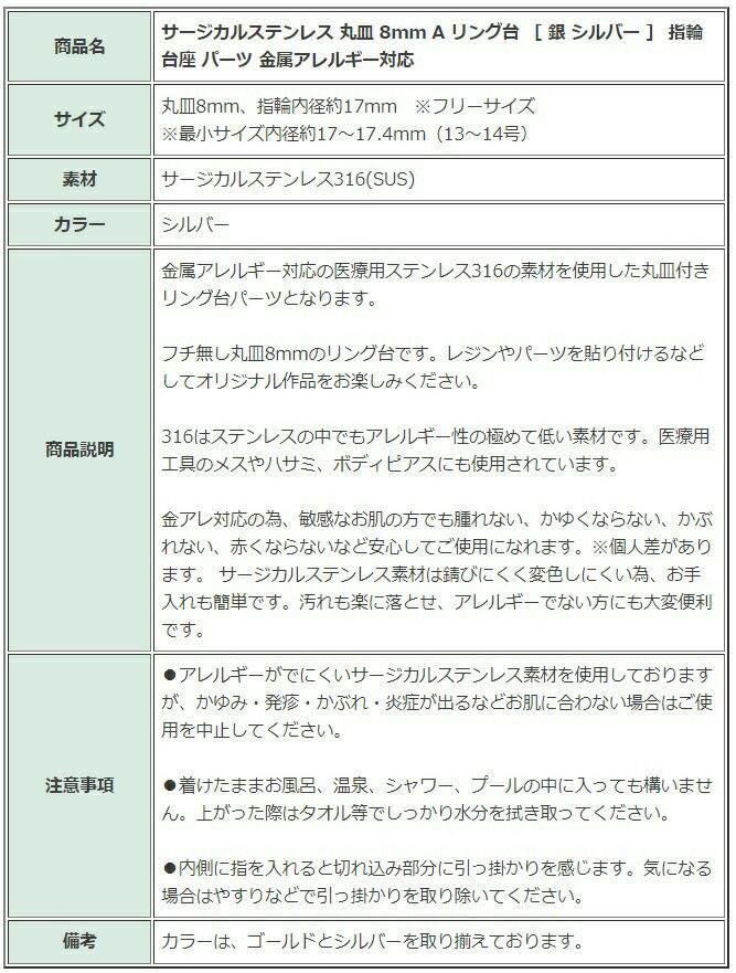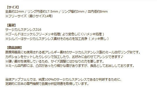 サージカルステンレス素材の指輪は変色しにくいリングパーツとして人気です。ストーンやカボションのセッティング用の爪留めリングや空枠指輪、各種サイズの丸皿リング台、シャワー台、ミール皿が付いた指輪台座を取り揃えているので作品にあったリングを選択してください。