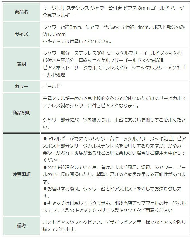 注意事項 ●アレルギーがでにくいシャワー台にニッケルフリーメッキ処理、ピアスポスト部分はサージカルステンレスを使用しておりますが、かゆみ・発疹・かぶれ・炎症が出るなどお肌に合わない場合はご使用を中止してください。