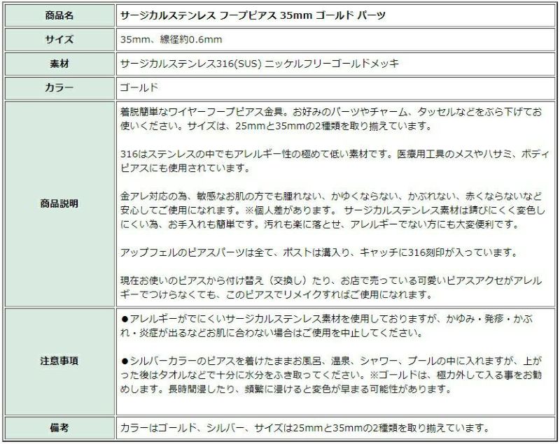 商品名 サージカルステンレス フープピアス 35mm ゴールド パーツ
