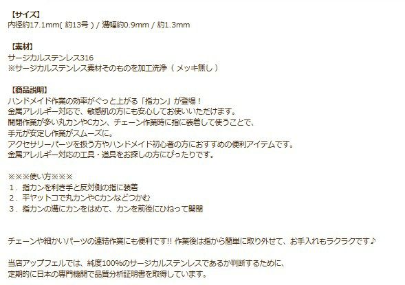 開閉作業が多い丸カンやCカン、チェーン作業時に指に装着して使うことで、
