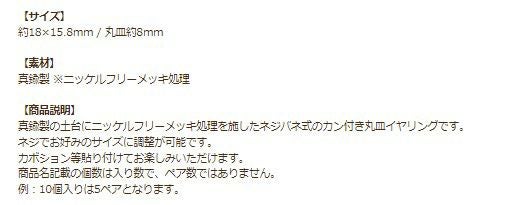 真鍮製の土台にニッケルフリーメッキ処理を施したネジバネ式のカン付き丸皿イヤリングです。