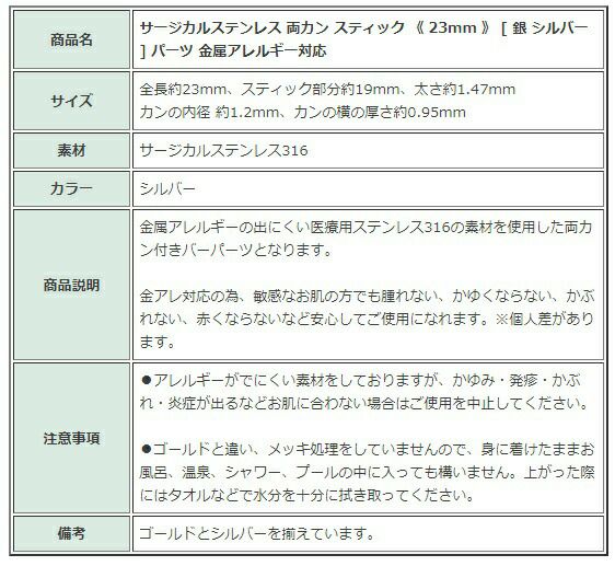 他の画像を見る 金属アレルギー対応 医療用 素材 316 バーパーツ スティック [10個] サージカルステンレス 両カン スティック 《 23mm 》 [ 銀 シルバー ] パーツ 金属アレルギー対応 当店特別価格 ¥ 739 税込 カートに入れる お気に入りに登録する