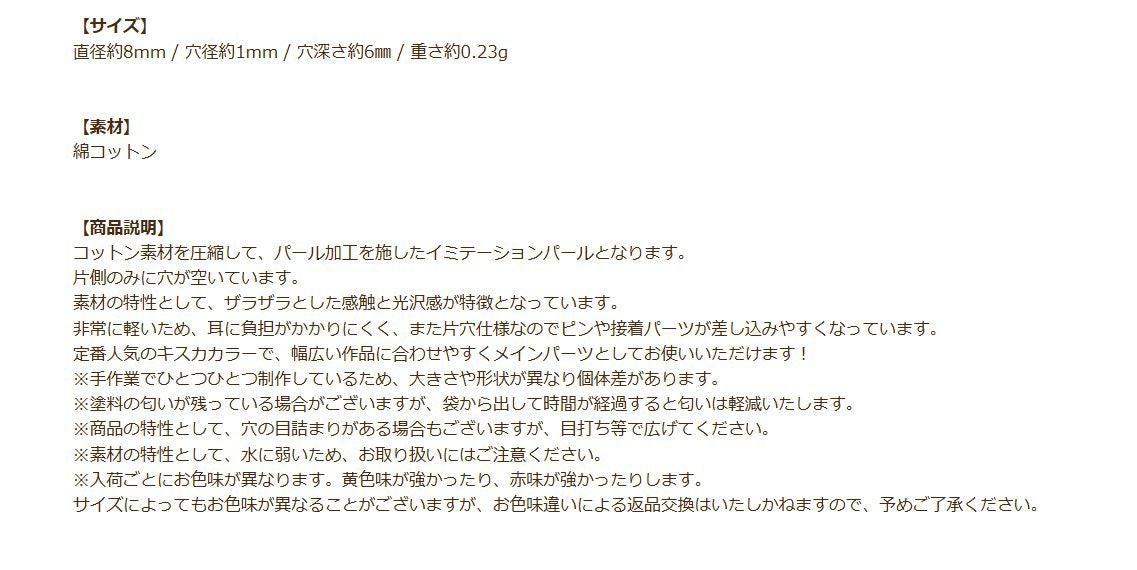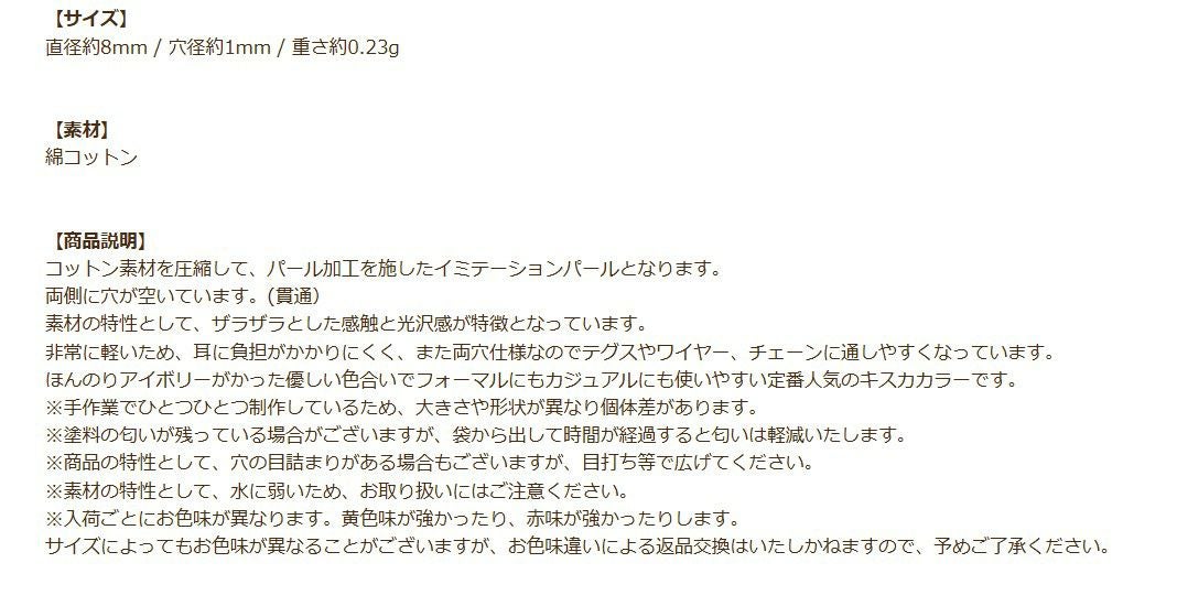 他の画像を見る アクセサリー ハンドメイド 手作り 手芸 材料 クラフト 真珠 [4個] コットンパール 【 両穴 】 8mm * キスカ * 丸 パーツ 素材 O-01 当店特別価格 ¥ 259 税込 カートに入れる お気に入りに登録する