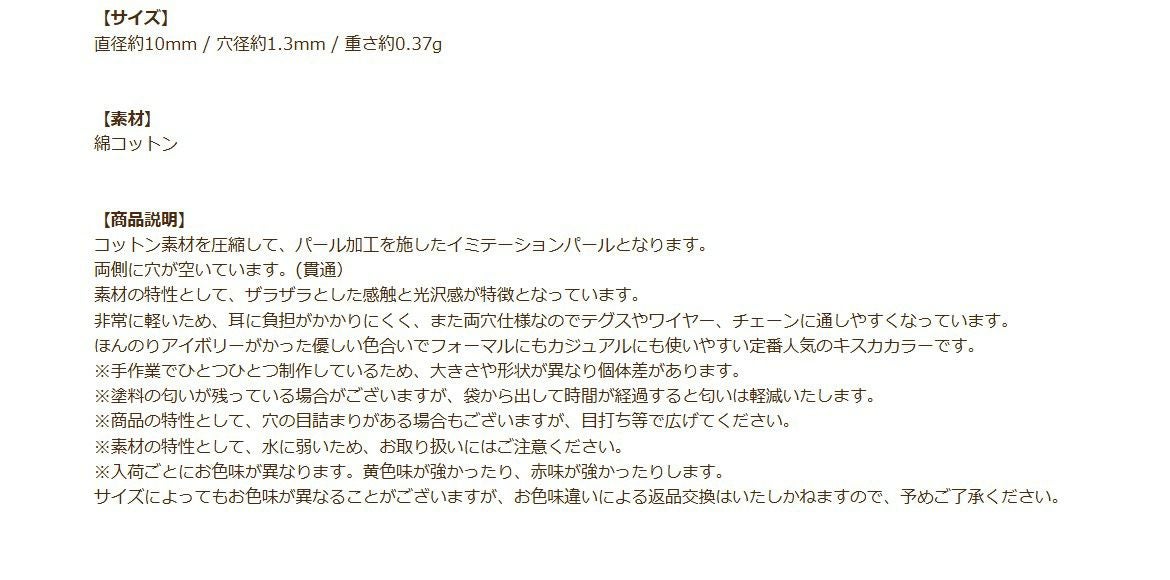 他の画像を見る アクセサリー ハンドメイド 手作り 手芸 材料 クラフト 真珠 [4個] コットンパール 【 両穴 】 10mm * キスカ * 丸 パーツ 素材 O-01 当店特別価格 ¥ 259 税込 カートに入れる お気に入りに登録する