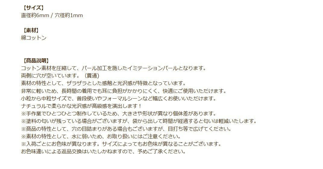 他の画像を見る アクセサリー ハンドメイド 手作り 手芸 材料 クラフト 真珠 [10個] コットンパール 【 両穴 】 6mm * ホワイト * 丸 パーツ 素材 O-01 当店特別価格 ¥ 198 税込 カートに入れる お気に入りに登録する