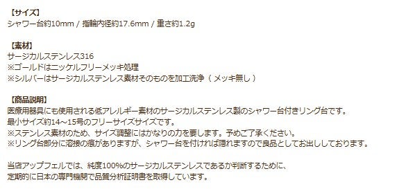 他の画像を見る 金アレ 316 素材 材料 ニッケルフリー 敏感肌 指輪 リング台 指輪台座 リング台 シャワー台付き * 10mm * [ ゴールド 金 ] サージカルステンレス 台座 パーツ 金属アレルギー対応 O-02 当店特別価格 ¥ 619 税込 〜 当店特別価格 ¥ 税込 詳細を見る お気に入りに登録する